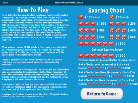 Farkle HD is farkle for your iPad for free. Players take turns rolling six dice to get 1's, 5's, straights, or three of a kind. Players compete by choosing whether to bank their points or risk it by rolling again in this on the edge of your seat game. Score more points by risking it all, but careful! You could lose it all if you farkel.