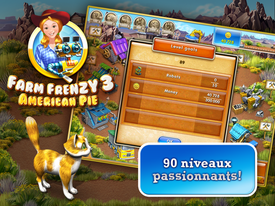 Saurez-vous exploiter les dernières avancées technologiques pour cultiver la terre, nourrir les animaux, collecter des produits et produire ? Bien sûr que oui ! Ne laissez pas trop les nouvelles animations loufoques vous détourner de votre tâche ! Offrant 90 tous nouveaux niveaux, un assortiment amusant de personnages inédits, la possibilité de construire de nouveaux bâtiments et de relever des défis, Farm Frenzy 3: American Pie n'a pas fini de vous détendre, et ce pendant longtemps encore !