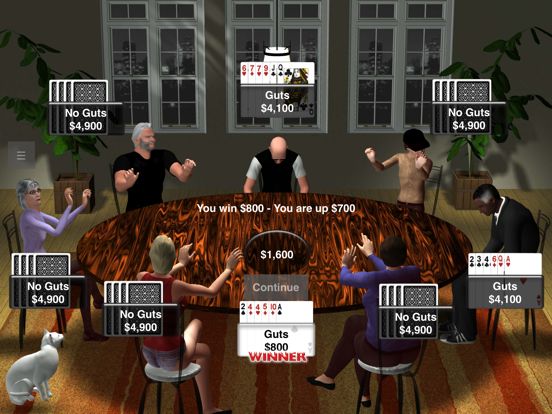 Guts Poker is a fast paced poker game where each player is dealt four cards and then must declare either in (has guts) or out (no guts). Two more cards are dealt, after which the winner with the best five card hand takes the pot. Losing players that called guts must then match the winning pot, which grows quickly.