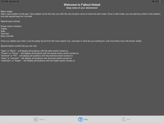 Fallout Location Notes allows you to store any notes about your adventures and retrieve them back when needed.