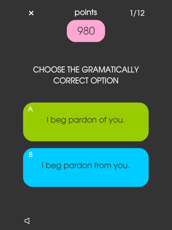 Two sentences appear – quickly choose the grammatically correct one. Your score depends on speed and accuracy! Prefer a relaxed pace? Try the untimed PRACTICE mode.