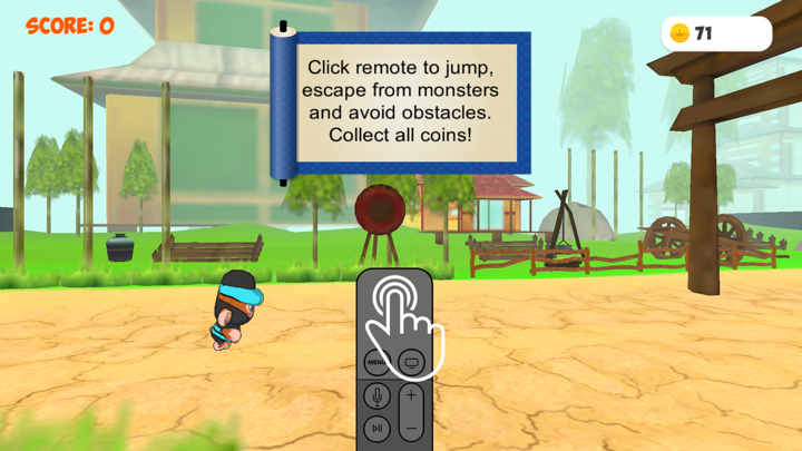 Tap remote to jump, escape from monsters and avoid obstacles. Collect all coins!