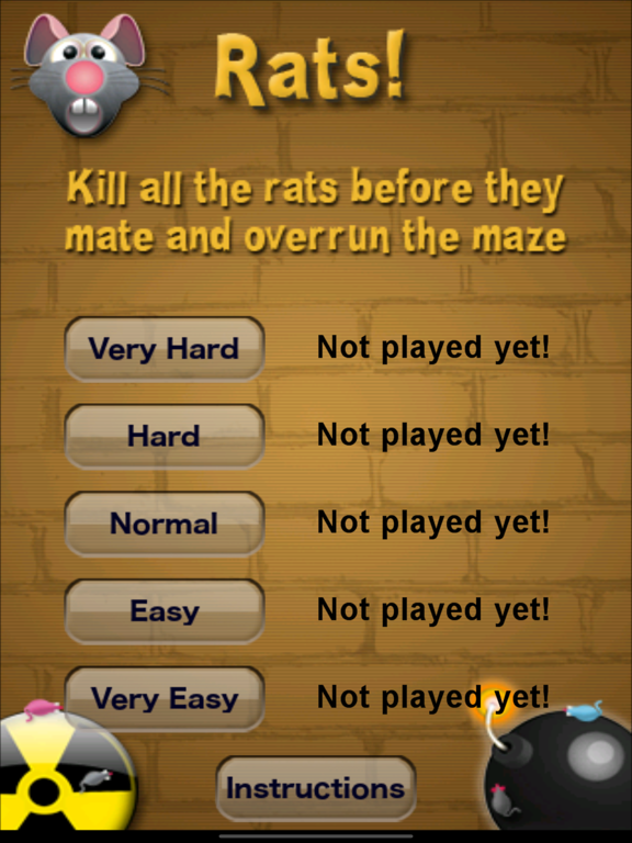Rats! is a frantic game of rodent extermination. You must kill all the rats before they have a chance to mate and overrun the maze. To do this you can use bombs, radioactive waste, gas, poison, death rats, blocks, and gender changing chemicals.