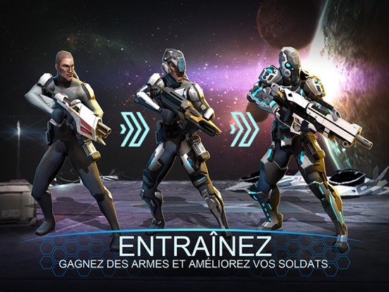ENTRAÎNEZ une équipe de soldats de l'espace d'élite! ÉQUIPEZ vos soldats avec des armes, des couvre-chefs et une armure en vue de batailles épiques! ATTAQUEZ les équipes rivales du système solaire! PARTEZ À LA CONQUÊTE de la galaxie, planètes après planètes. BATTEZ-VOUS pour la victoire et contrôlez l'univers!