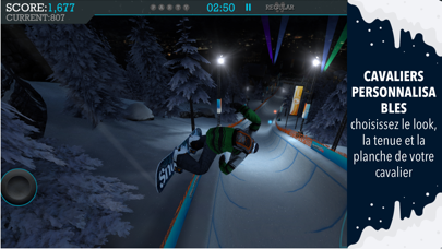 Sélectionnez entre 16 snowboarders et personnalisez chacune d'elles à votre préférence en choisissant votre équipement préféré. Une collection massive de tableaux allant de différentes tailles et designs sont disponibles vous permettant de compléter les compétences et les capacités de votre coureur.