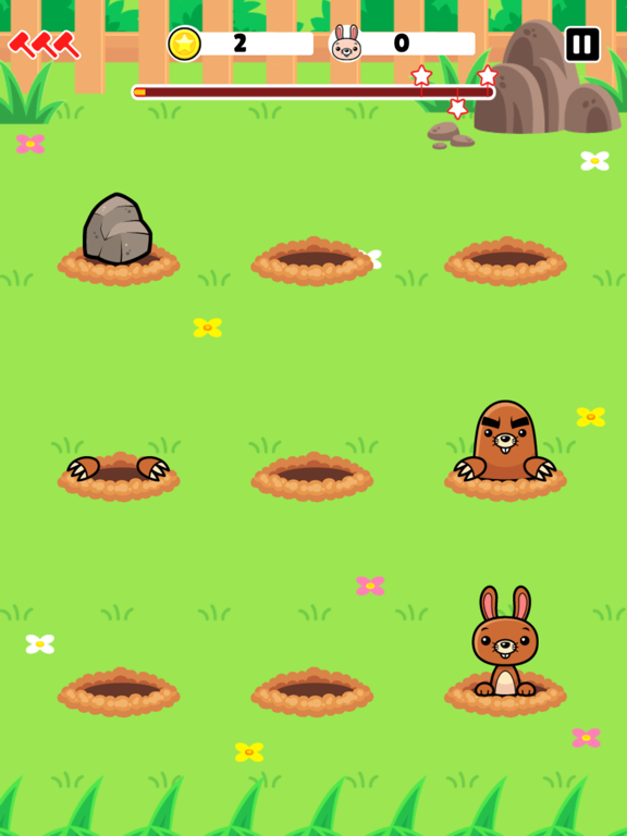 Players must tap the moles as soon as they pop out of their holes to score points. As the game advances, the moles appear faster, testing the player's reflexes and coordination. Rabbits also appear, and tapping them results in losing points or special coins, adding an extra layer of challenge.