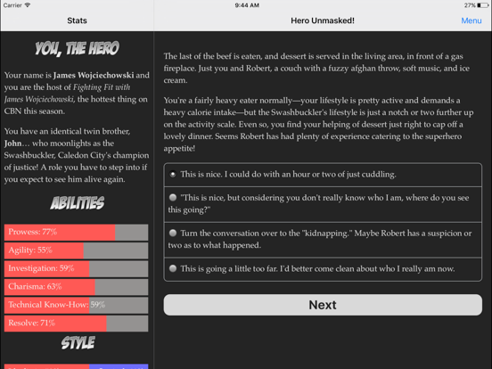 You can now choose a font in the Settings menu. Switch to Helvetica for crisp sans-serif text, or try the OpenDyslexic font, designed against some common symptoms of dyslexia. If you enjoy "The Hero Unmasked!", please leave us a written review. It really helps!