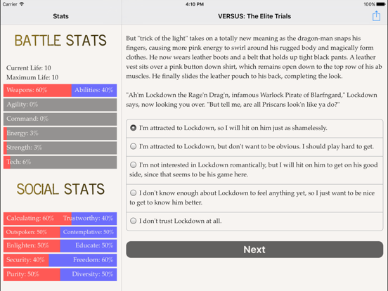 You can now choose a font in the Settings menu. Switch to Helvetica for crisp sans-serif text, or try the OpenDyslexic font, designed against some common symptoms of dyslexia. If you enjoy "VERSUS: The Elite Trials", please leave us a written review. It really helps!