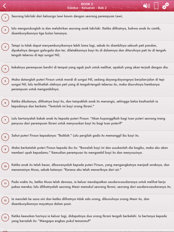 Aplikasi ini memberi Anda kemampuan untuk membaca dan mendengarkan Semua buku Perjanjian Lama dan Perjanjian Baru di Iphone / Ipad / Ipod Touch Anda.