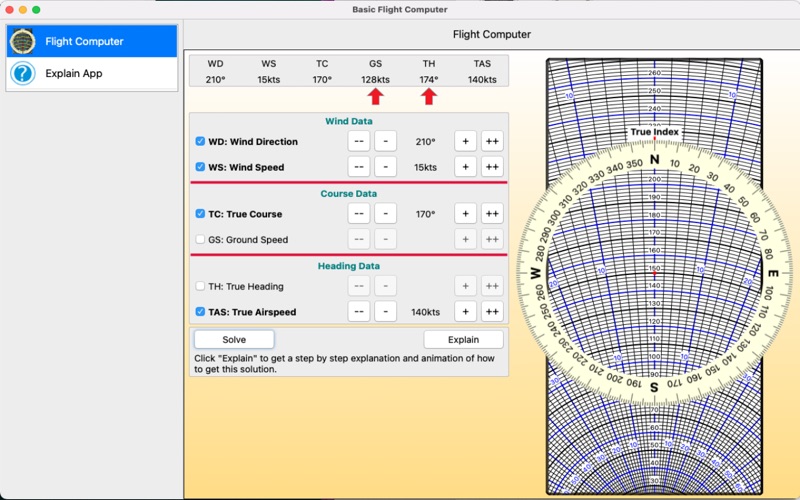 This app solves a wind triangle by allowing you entering four values out of six (three speeds and three angles) and calculating the remaining two. It then explains how you get these results with a flight computer, by animating it: it rotates the disk, slides it and add marks. It also shows what value to use for each step towards the solution.