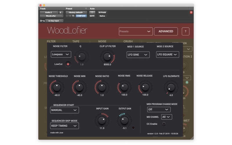 The WoodLofier combines 4 different sections to make your sound more lofi or to add some creative twist : filtering (and Sample Rate reduction), a Tape wobble unit, Noise addition and Crushing (clipping, bit reduction and saturation).