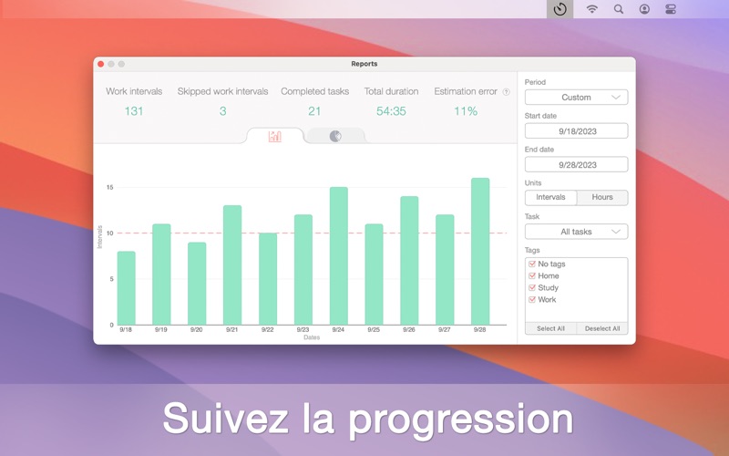 Rester concentré sur une tâche semble être un véritable défi pour la génération attachée à l'écran. Be Focused vous permet de faire les choses en morcelant les tâches particulières en intervalles distincts, séparés par de courtes pauses. C'est une manière étonnamment efficace de conserver la motivation et la concentration. Créez des tâches, configurez des pauses et suivez votre progression tout au long de votre journée, votre semaine ou une période spécifique. Utilisez votre iPhone, votre iPad ou votre Mac : vos appareils sont toujours synchronisés.