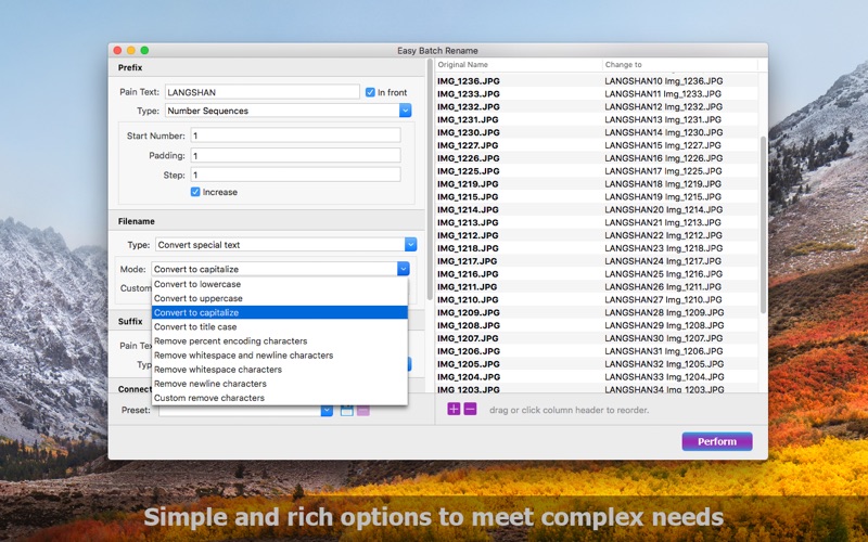 You don't have to be careful about making mistakes, and with instant preview, you can visually see the modified file name. You can also adjust the order of files by dragging and dropping or automatically sorting features.