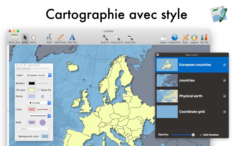 Les cartes créées avec Magic Maps ont un aspect signature et de haute qualité car le programme est construit à partir de zéro en utilisant la technologie Core Graphics d'Apple. Les couches de carte peuvent être gérées de manière similaire aux calques dans Photoshop : il suffit de faire glisser pour réorganiser, cocher une case pour ajouter une ombre portée, utiliser le curseur pour modifier l'opacité. Choisissez des couleurs, des formes de points et des largeurs de ligne personnalisées pour créer l'apparence que vous souhaitez.