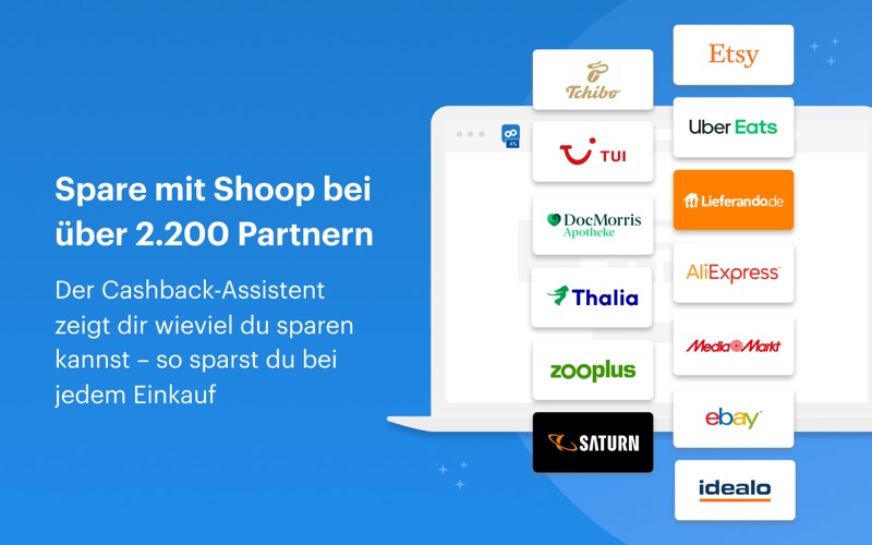 Hol’ dir jetzt den kostenlosen Cashback-Assistenten für deinen Browser und spare mit nur einem Klick bei all’ deinen Online-Bestellungen. Bei 2.000+ kooperierenden Online-Shops – darunter Top-Partner wie MediaMarkt, Lieferando, ebay, Groupon – sowie wöchentlichen Aktionen, exklusiven Gutscheinen und Rabatten ist für jeden etwas dabei. Die Zeitschrift Finanztest bestätigt Shoop: „Sehr hohe Rabatte und viele umsatzstarke Partnershops”.
