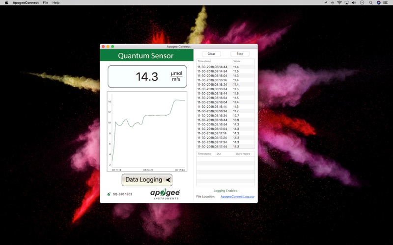 Apogee Instruments Apogee Connect software for macOS versions 10.15 and above is a great tool for interfacing with Apogee’s line of USB sensors including our quantum sensors, pyranometers, and UV sensors. Features include real-time readings, graphs, datalogging (with customizable sampling and logging intervals), and the ability to initiate unattached field-logging, where the sensor head stores up to 10,000 readings when attached to a “always-on” USB power supply.
