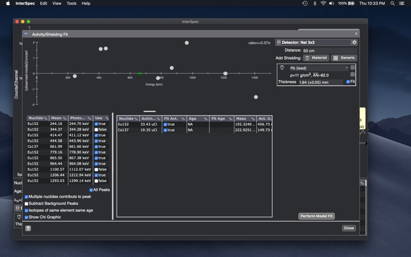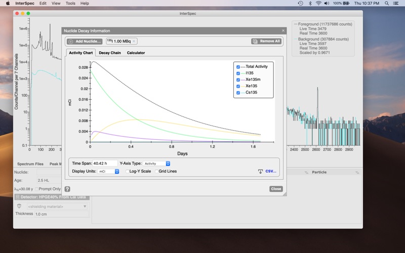 InterSpec also provides a number of other tools useful for analyzing radiation data including spectral file format converting, dose rate calculations, interactive nuclide decay and reference information, gamma cross section calculations and references, and more.