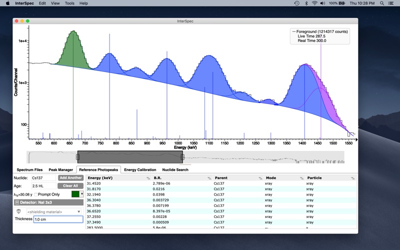 InterSpec assists in analyzing spectral nuclear radiation data, using a peak-based methodology. Common uses include identifying nuclides present, determining source activity, shielding amounts, source age, or other nuclear reactions present.