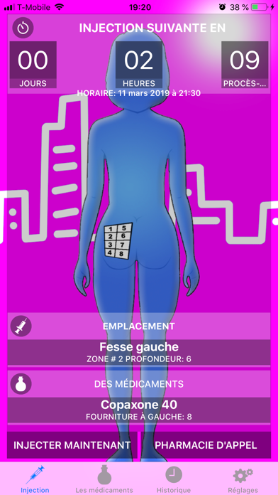 L'application aide en tournant de manière optimale les zones d'injection, suivi de la quantité de médicaments.