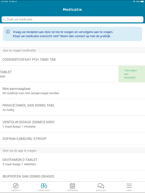 • Vraag herhaalrecepten direct uit uw medicatielijst aan en ontvang herinneringen indien u uw medicatie opnieuw nodig heeft.