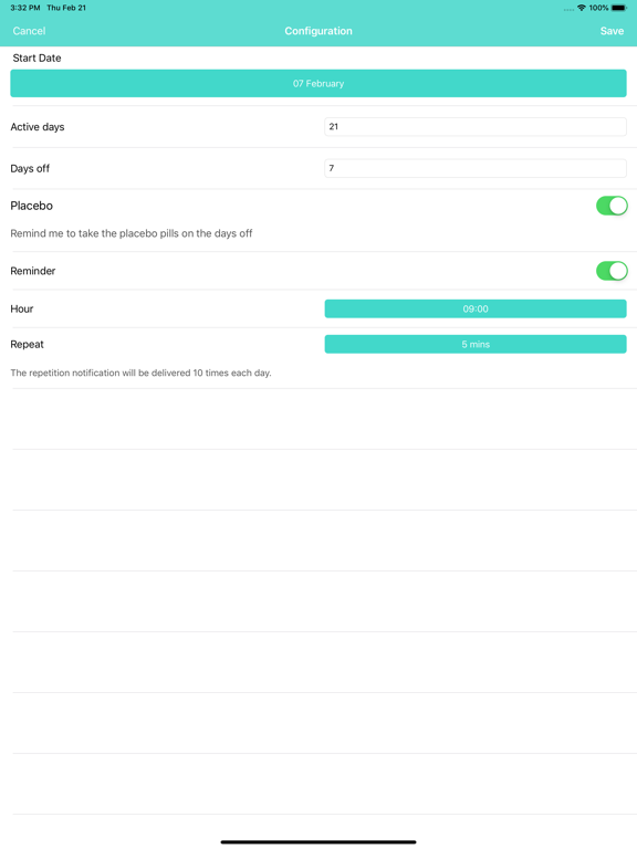 - Application 100 % personnalisable : adaptez-la à votre type de pilule, au nombre de jours, aux placebos, etc.