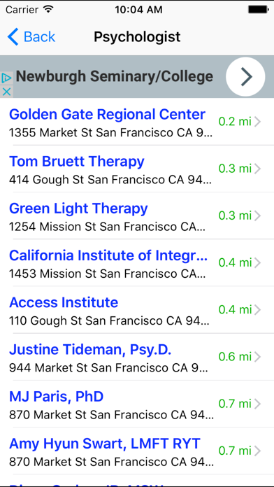 This handy app quickly identifies your location and lets you choose the nearest Psychologist, Psychiatrist, Marriage & Family Therapist, Life Coach, Clinical Social Worker, and more!