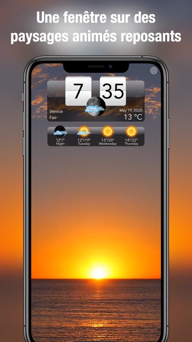 De magnifiques paysages océaniques, des scènes de pluie apaisantes, de vraies tempêtes et bien d'autres images vous permettent de visualiser sur votre écran le temps qu'il fait dans votre région. Il est également possible de sélectionner différentes conditions météo en fonction de votre humeur ou de paramétrer un affichage aléatoire des scènes. Les paysages relaxants sont parfaits pour éliminer le stress tout en regardant la météo !