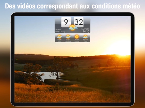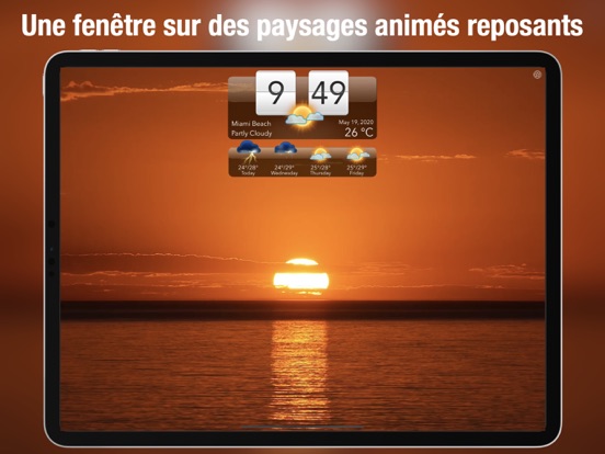 De magnifiques paysages océaniques, des scènes de pluie apaisantes, de vraies tempêtes et bien d'autres images vous permettent de visualiser sur votre écran le temps qu'il fait dans votre région. Il est également possible de sélectionner différentes conditions météo en fonction de votre humeur ou de paramétrer un affichage aléatoire des scènes. Les paysages relaxants sont parfaits pour éliminer le stress tout en regardant la météo !