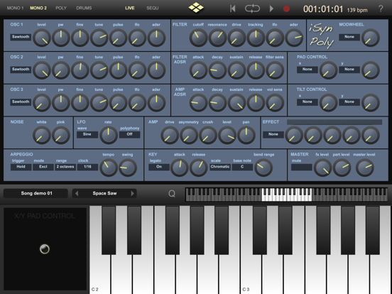 iSyn Poly is an electronic music studio for use with Apple iPad. iSyn Poly places an unbelievable number of features including three studio-quality, fully programmable virtual analog synthesizers and a drum machine packed in just three different screens on your iPad !