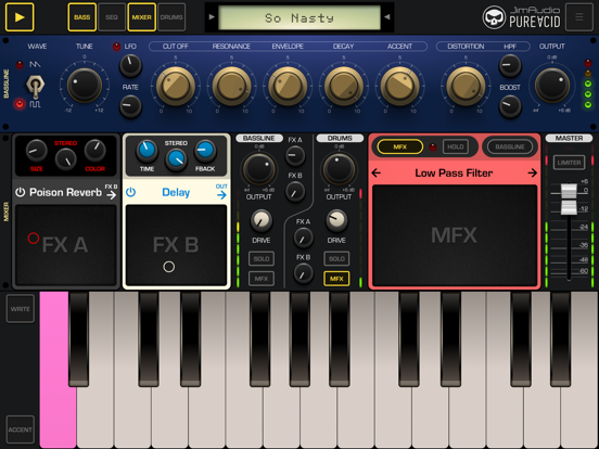Pure Acid is a top quality bassline synthesizer and drum machine in one app! Inspired by classic hardware bassline synthesizers and rhythm machines, which changed musical world back in 80's, like the legendary TB-303 synthesizer, TR-808 / 707 / 909 rhythm boxes and their numerous replicas, Pure Acid is designed to bring back the feeling of retro analog gear in every detail in terms of sound, as well as to provide new functions previously unavailable in the original devices to make your music creation workflow fast and fun! A large number of factory preset patterns will immerse you into an exciting world of Acid House, Techno, Hardcore and Big Beat music genres, which will inspire you to create your own basslines and rhythms for your compositions!