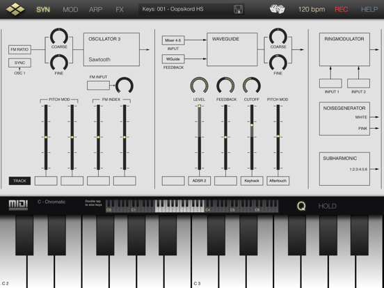 • Play melodies live with the onscreen keyboard. Drag fingers for slides and vibrato.