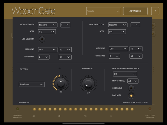 The Wood'nGate is an audio gate which is both a standalone app supporting IAA (Inter-App Audio) and an AUv3 audio unit plugin.