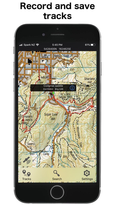 The app has a full suite of navigation functions including GPS location, compass orientation, distance to map locations, track recording and graphing, route creation and following, hillshade and slope angle overlays, import/export of gpx and kml files, search functions for named places and user data. Add and edit your own locations and routes and plot elevation profiles. Use your camera view to identify surrounding peaks and match with local topography. Uses an intuitive simple interface with one-touch access to all functions.