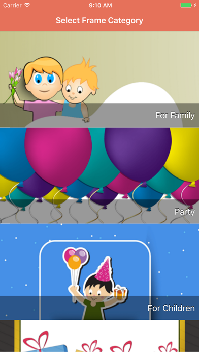 1. La première étape consiste à choisir le type de cadre que vous souhaitez utiliser. Pour vous faciliter la tâche, nous avons divisé les cadres disponibles en différentes catégories, afin que vous puissiez créer la carte parfaite pour chaque occasion. Vous trouverez des cadres pour la famille, les fêtes, les enfants, avec des cadeaux, des gâteaux d'anniversaire, ou même des cadres simples et élégants.