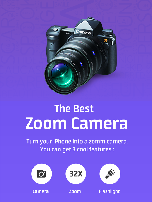 Super Zoom Telephoto Camera Pro could transform your iPhone or iPad into a full screen zoom camera with flashlight! You can choose between 6 auto-zoom scales(2x, 3x, 4x, 8x, 16x, 32x) and pinch to zoom in/out manually from 1x to 32x.