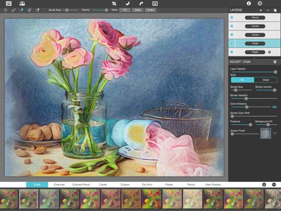 Pastello makes it simple and convenient to take an image and change it into Pastel, Chalk, Charcoal, Crayon, Colored Pencil and Graphite drawings. Use alone or combine these medias using powerful layers to produce interesting expressive sketch effects filled with colorful personality and passion. And the best part is Pastello does all the work.