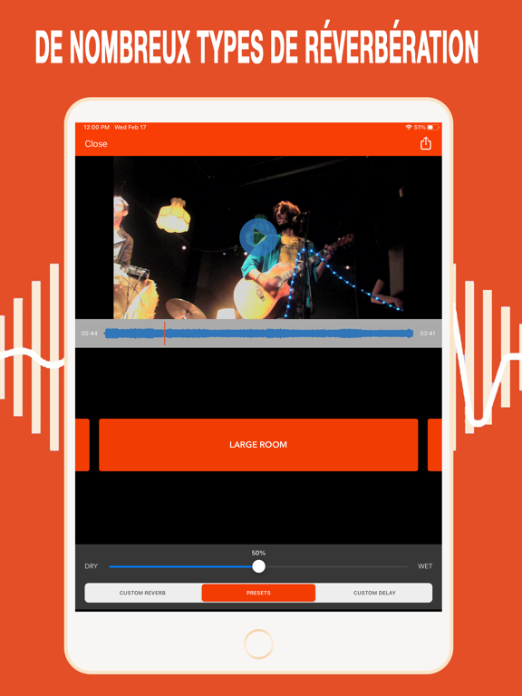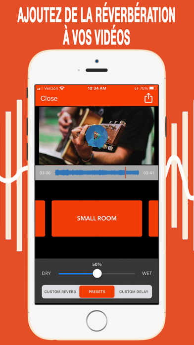 Importez une vidéo et choisissez parmi une variété de préréglages de réverbération. Réglez le Wet/Dry pour ajouter un léger effet ou beaucoup. Créez votre propre réverbération personnalisée et délai personnalisé.