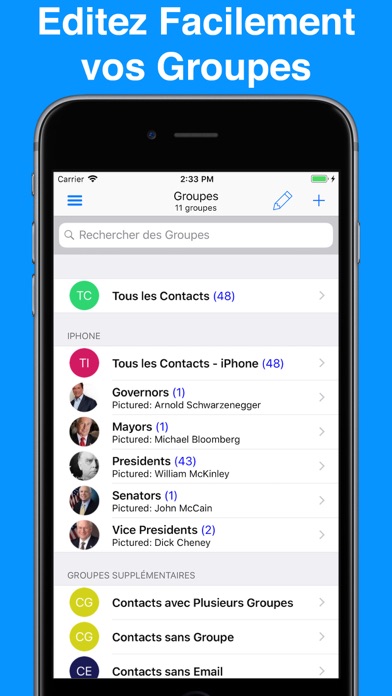 • L'ensemble de vos contacts voir indépendamment du fait qu'ils ont été créés dans iCloud, CardDAV, Facebook, Exchange, votre appareil mobile, ou tout autre type de compte de contact