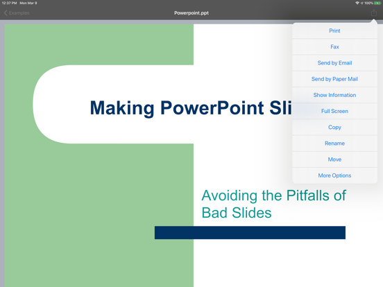(The iOS does not support/allow this app to print files within another app's storage space—for example, files stored in Pages, Numbers, Safari, Notes, Mail, etc. Therefore, files created in other apps must be imported into this app.)