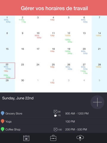 Définissez vos horaires. Voyez-les tous d'un coup d'œil. Configurez des alertes pour vous rappeler. Additionnez vos heures. Partagez votre emploi du temps avec votre famille et vos amis.