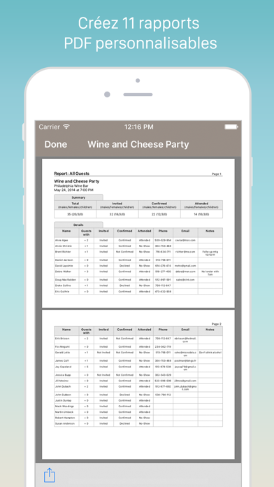 Guest List Organizer est la solution tout-en-un pour l’organisation de vos événements. Il vous suffit d'importer des contacts à partir de votre carnet d'adresses et de vous laissez porter. Grâce à l'intégration d'iCloud, le programme synchronise automatiquement toutes les informations des hôtes entre vos appareils. Notez les convives présents en toute simplicité et créez ensuite des rapports PDF contenant des informations complètes pour tous les invités (présents, absents, en attente de confirmation, etc.). Et que la fête commence !