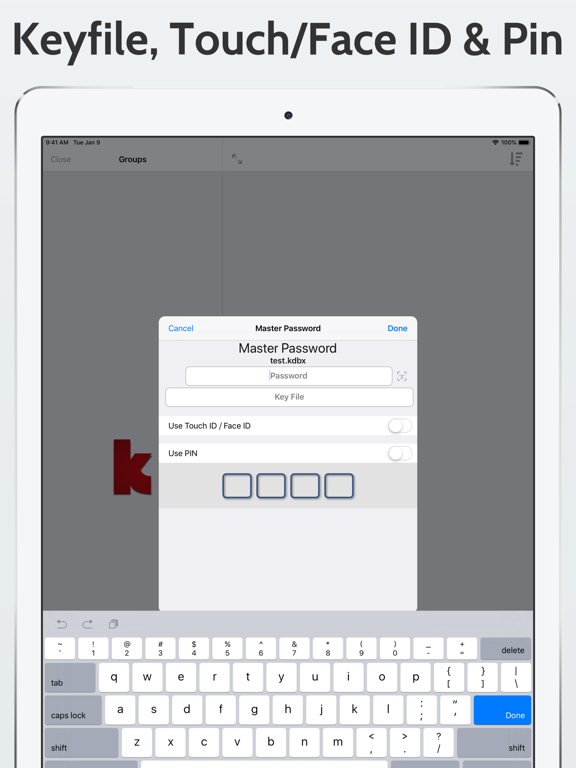 • Touch ID or PIN protection (securely stores the master key in iOS Keychain)