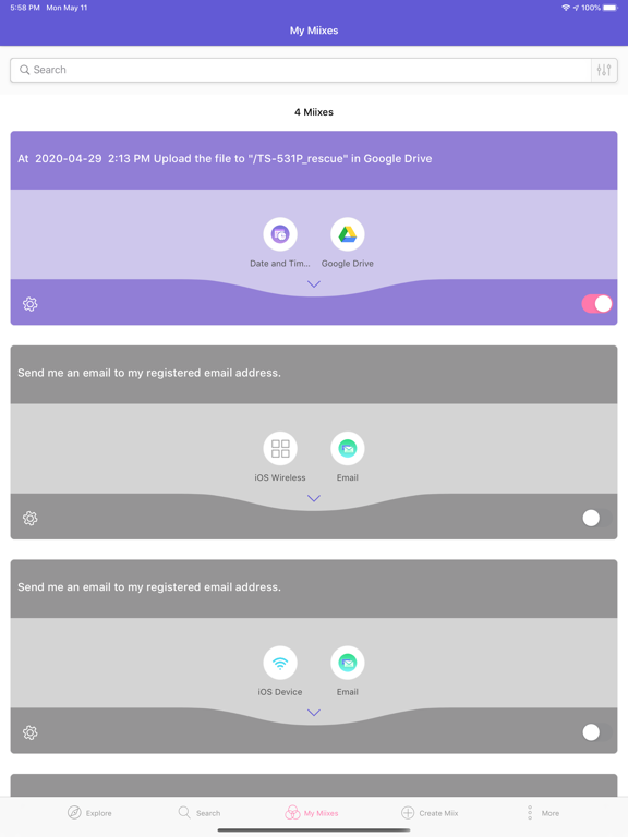 Qmiix connects different apps, allowing you to create custom scenarios called “Miixes”. Users create a miix using a Trigger and one or more Actions. A Trigger is a pre-defined condition which tells Qmiix to execute an action, an Action is an execution of pre-defined task within the specified app.