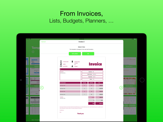 Templates for Numbers (for iPad, iPhone, iPod touch) is an amazing add-on for Apple's Numbers app. It provides 55 templates suitable for various tasks.