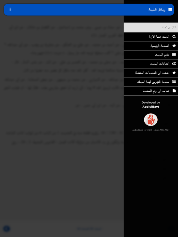 مجموعة من 29 مجلدات کل کتاب وسائل الشیعة مع امکان البحث في کل المجلدات، امکان اضافة الصفحة الخاصة الی الصفحات المفضلة و تغییر لون المتن. هذا الکتاب مرجع مهم فی الفقه الشیعي.