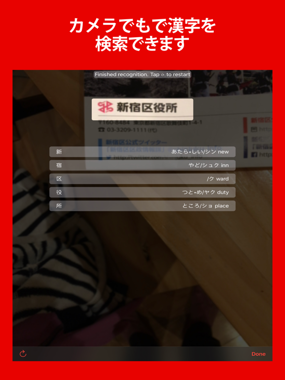 「漢字検索」は、手書きで漢字を検索するためのアプリケーションです。検索した漢字の用例、およびその英語訳を素早く表示させることができます。手書きの他にカメラでも漢字を検索できます。