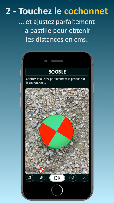 Booble permet de mesurer, lors d’une partie de pétanque, les distances boules/cochonnet. Son interface est très simple et intuitive :
