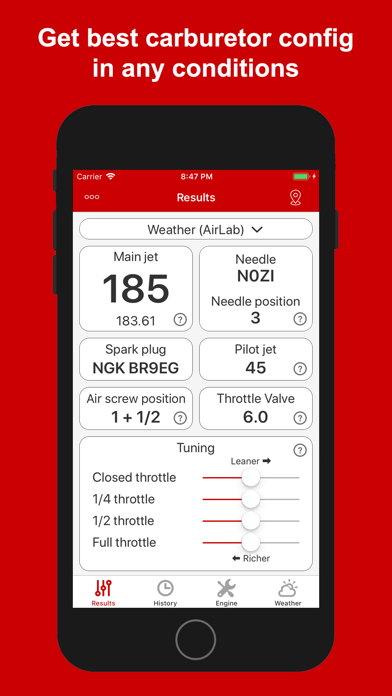• Historique de toutes vos configurations de carburateur