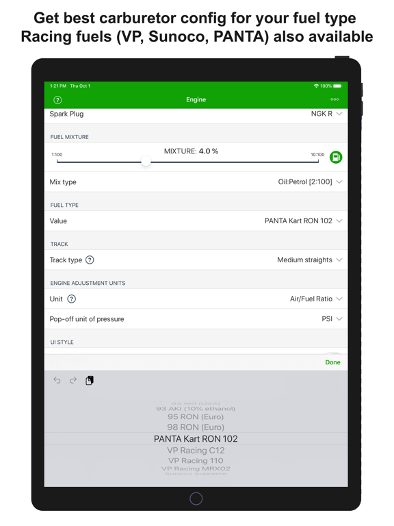 • Type de carburant sélectionnable (essence avec ou sans éthanol, carburants Racing disponibles, par exemple: VP Racing, Sunoco, Panta Kart Ron 102)