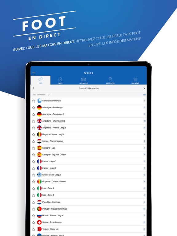 - Des matchs en direct live (Compos, Buteurs, Cartons, Commentaires en live, Stats, Photos)